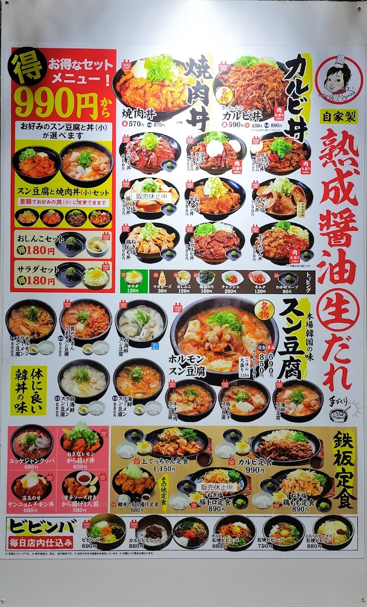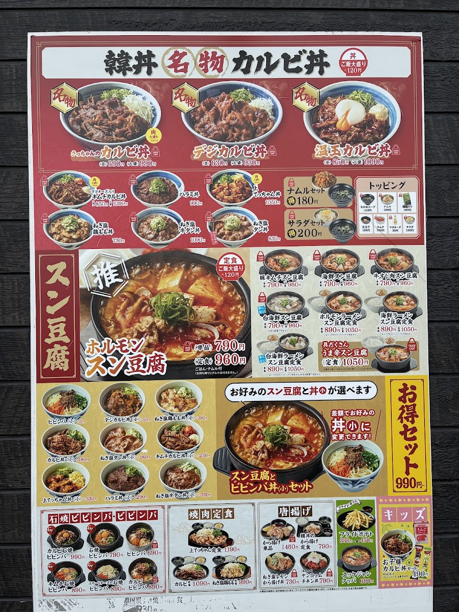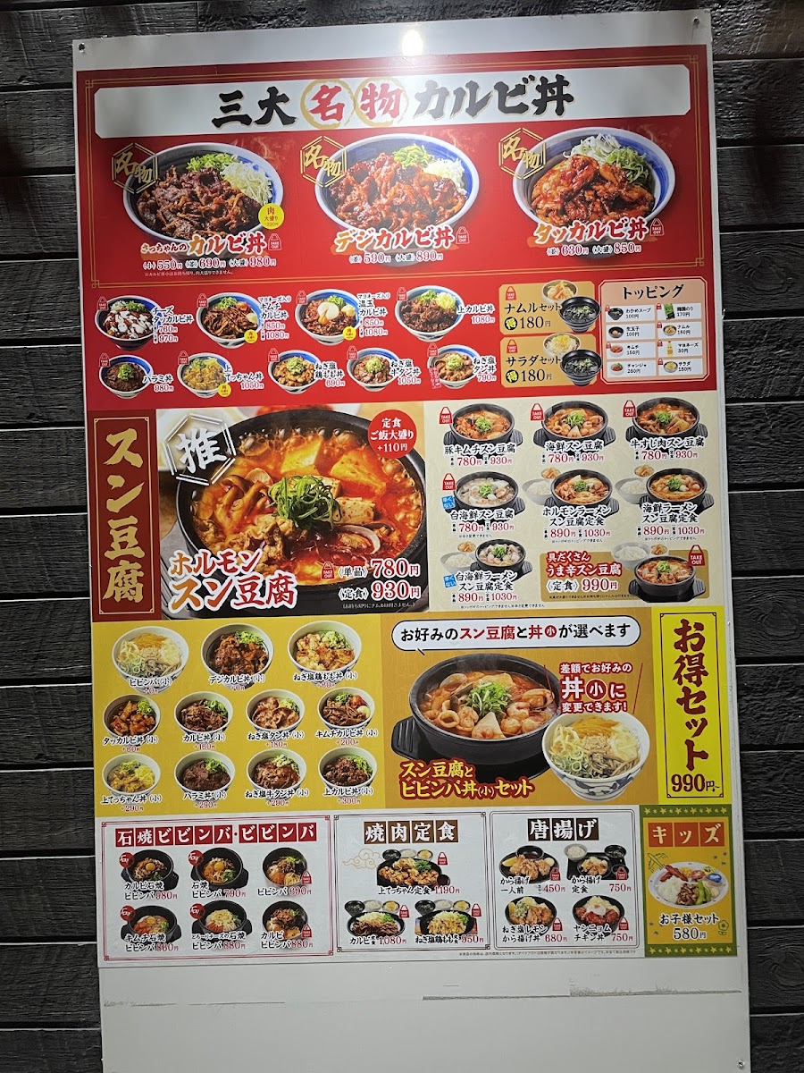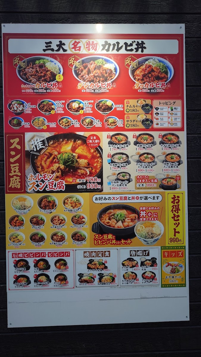 Kandon Ritto offers a delightful menu that caters to a variety of tastes, with a strong emphasis on rich, flavorful dishes. Standout items include the 海鮮スンドゥブとミニカルビ丼セット, which pairs spicy seafood sundubu with a mini kalbi rice bowl, offering a satisfying balance of heat and umami. Another fan favorite is the ねぎ 塩 鶏 もも肉 定食, a simple yet flavorful dish of seasoned chicken thigh served with rice and side dishes, perfect for those seeking something hearty. Meat lovers will appreciate the カルビ焼肉定食, a grilled kalbi set that delivers tender and savory grilled beef, complemented by rice and a side of pickled vegetables. For a sizzling experience, the カルビ入り石焼ビビンバ 卵はトッピング provides a hot stone bowl of bibimbap with kalbi and an optional egg topping, combining crispy rice with rich, savory flavors. The さっちゃんのカルビ丼 並 サラダセット serves up a generous portion of kalbi over rice with a refreshing salad, making for a well-rounded meal. Fans of noodle soups can enjoy the comforting ユッケジャンラーメン, a spicy, savory beef broth ramen that warms the soul. For something more indulgent, the 温玉カルビ丼 肉増し offers an extra serving of meat over a kalbi rice bowl topped with a soft-boiled egg. The スンドゥブとカルビ丼並 combines a classic sundubu with a traditional kalbi rice bowl, while the カルビ丼ミニとスンドゥブセット gives a mini portion of kalbi rice paired with sundubu for those seeking a lighter yet satisfying option. If you're craving something with more meat, the 上てっちゃん丼 肉大盛り offers a hearty serving of beef on rice, while the 上てっちゃん丼 肉1 5倍 テイクアウト allows you to take that extra portion of meat home. Kandon Ritto's menu provides a variety of satisfying and flavorful options, ensuring there's something for everyone.