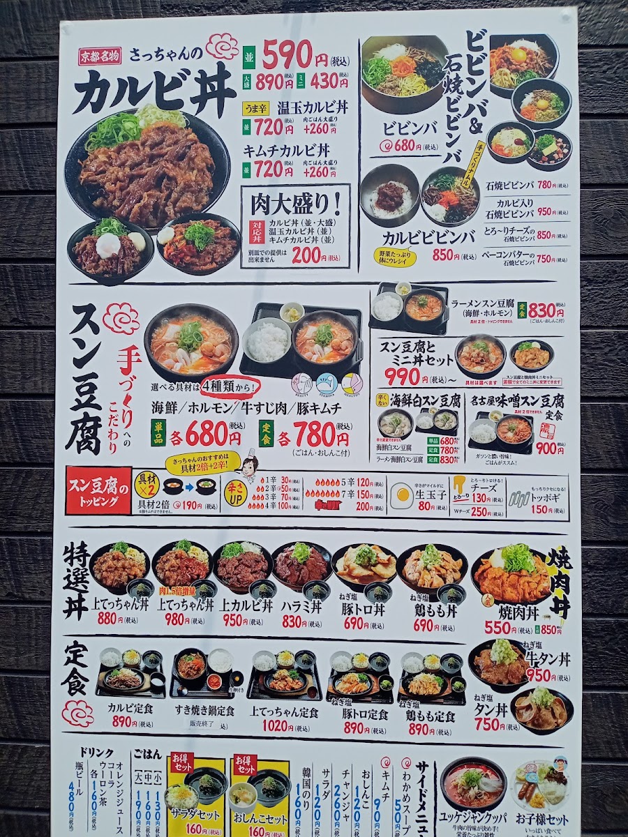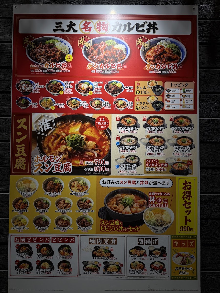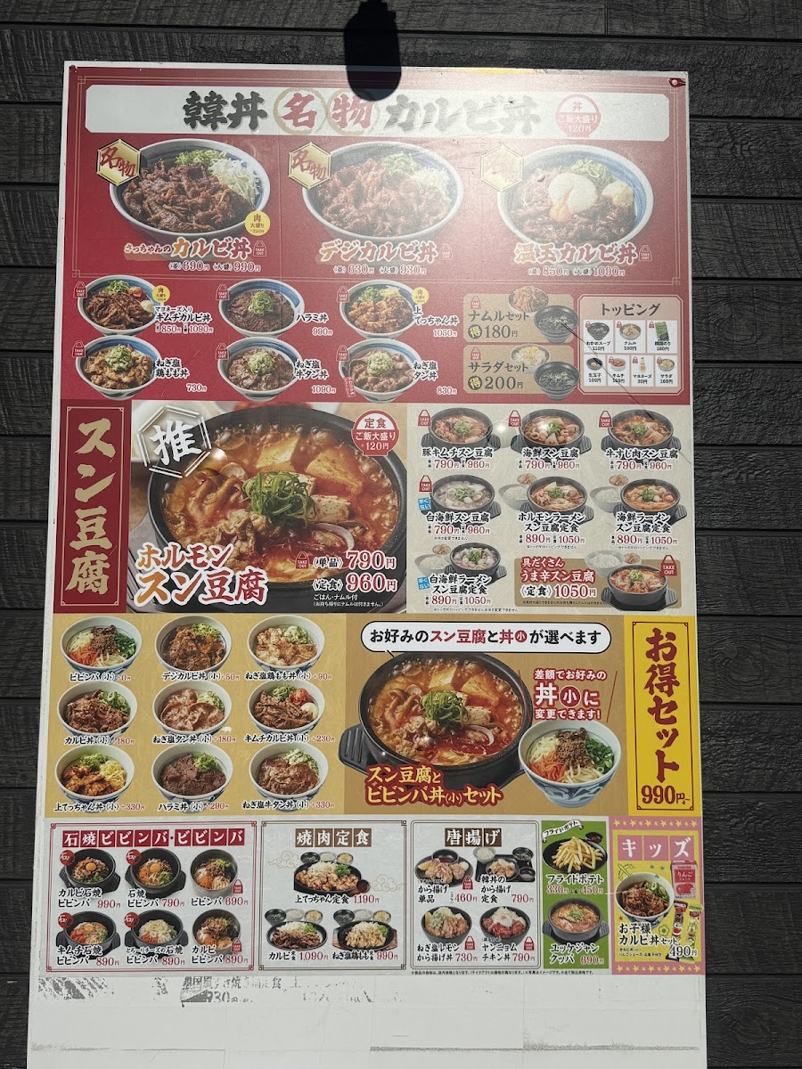 Kandon Ritto offers a delightful menu that caters to a variety of tastes, with a strong emphasis on rich, flavorful dishes. Standout items include the 海鮮スンドゥブとミニカルビ丼セット, which pairs spicy seafood sundubu with a mini kalbi rice bowl, offering a satisfying balance of heat and umami. Another fan favorite is the ねぎ 塩 鶏 もも肉 定食, a simple yet flavorful dish of seasoned chicken thigh served with rice and side dishes, perfect for those seeking something hearty. Meat lovers will appreciate the カルビ焼肉定食, a grilled kalbi set that delivers tender and savory grilled beef, complemented by rice and a side of pickled vegetables. For a sizzling experience, the カルビ入り石焼ビビンバ 卵はトッピング provides a hot stone bowl of bibimbap with kalbi and an optional egg topping, combining crispy rice with rich, savory flavors. The さっちゃんのカルビ丼 並 サラダセット serves up a generous portion of kalbi over rice with a refreshing salad, making for a well-rounded meal. Fans of noodle soups can enjoy the comforting ユッケジャンラーメン, a spicy, savory beef broth ramen that warms the soul. For something more indulgent, the 温玉カルビ丼 肉増し offers an extra serving of meat over a kalbi rice bowl topped with a soft-boiled egg. The スンドゥブとカルビ丼並 combines a classic sundubu with a traditional kalbi rice bowl, while the カルビ丼ミニとスンドゥブセット gives a mini portion of kalbi rice paired with sundubu for those seeking a lighter yet satisfying option. If you're craving something with more meat, the 上てっちゃん丼 肉大盛り offers a hearty serving of beef on rice, while the 上てっちゃん丼 肉1 5倍 テイクアウト allows you to take that extra portion of meat home. Kandon Ritto's menu provides a variety of satisfying and flavorful options, ensuring there's something for everyone.